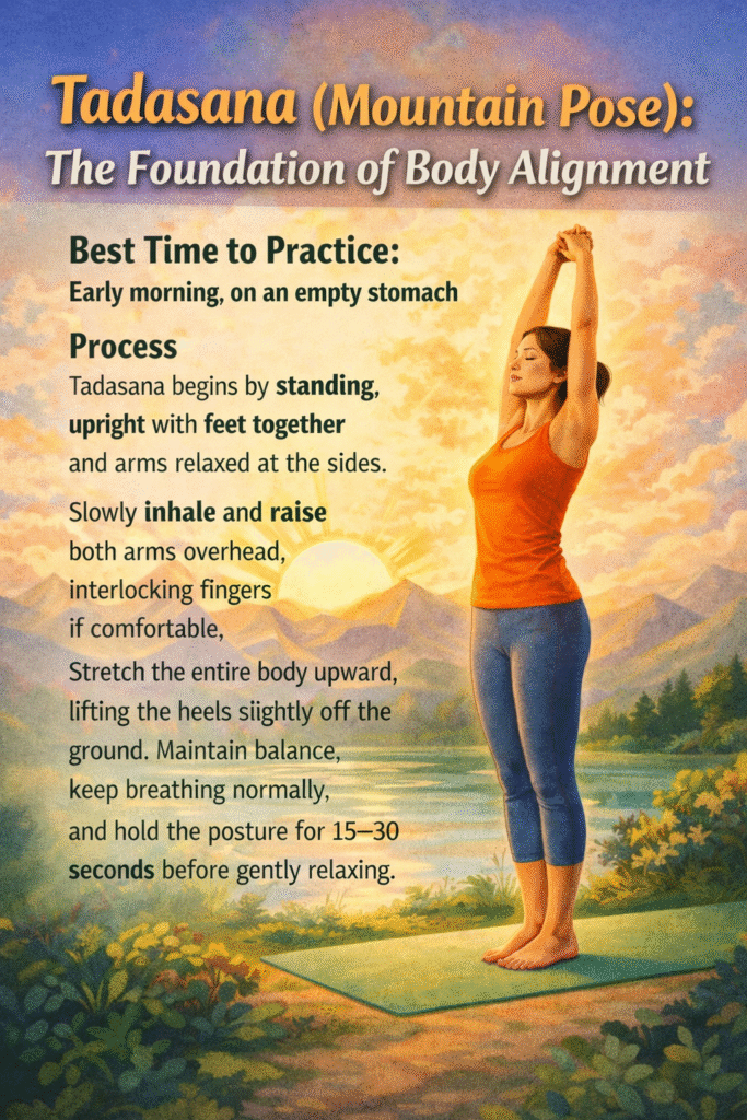 Tadasana begins by standing upright with feet together and arms relaxed at the sides. Slowly inhale and raise both arms overhead, interlocking fingers if comfortable. Stretch the entire body upward, lifting the heels slightly off the ground. Maintain balance, keep breathing normally, and hold the posture for 15–30 seconds before gently relaxing.