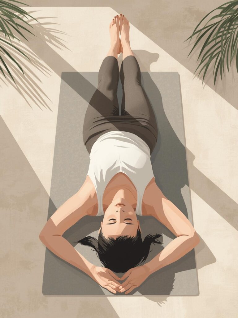 A final relaxation pose lying supine. Research reveals it integrates practice benefits, reducing heart rate and promoting deep rest.561e07