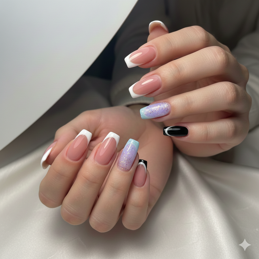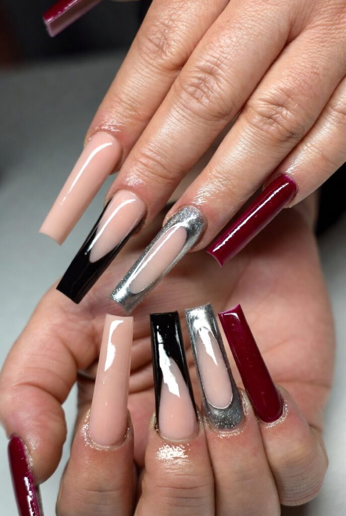 Common colors include nude, red, burgundy, ombré blends, and glossy finishes.